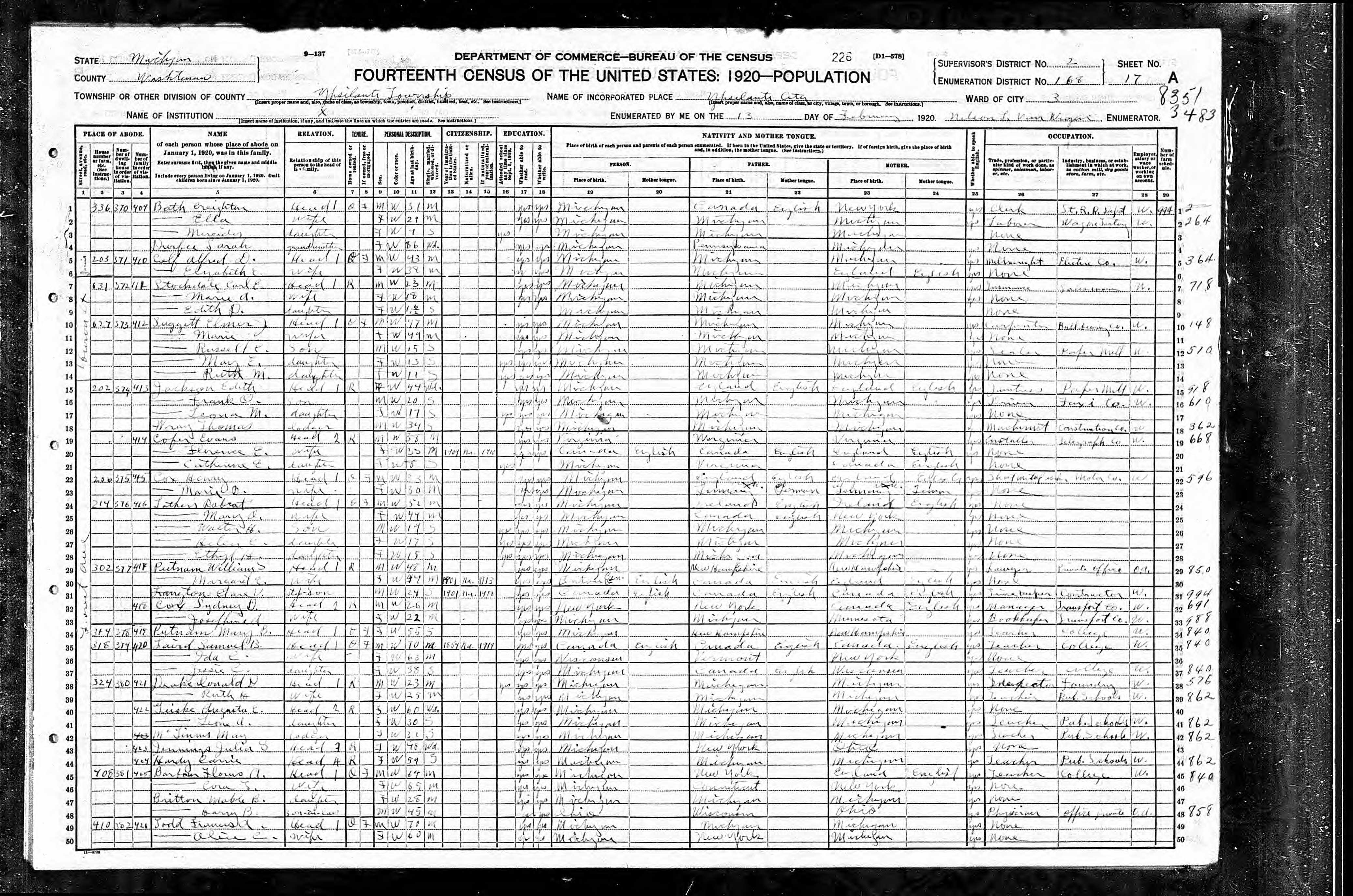 1920 Census Ypsilanti, Washtenaw County, Michigan