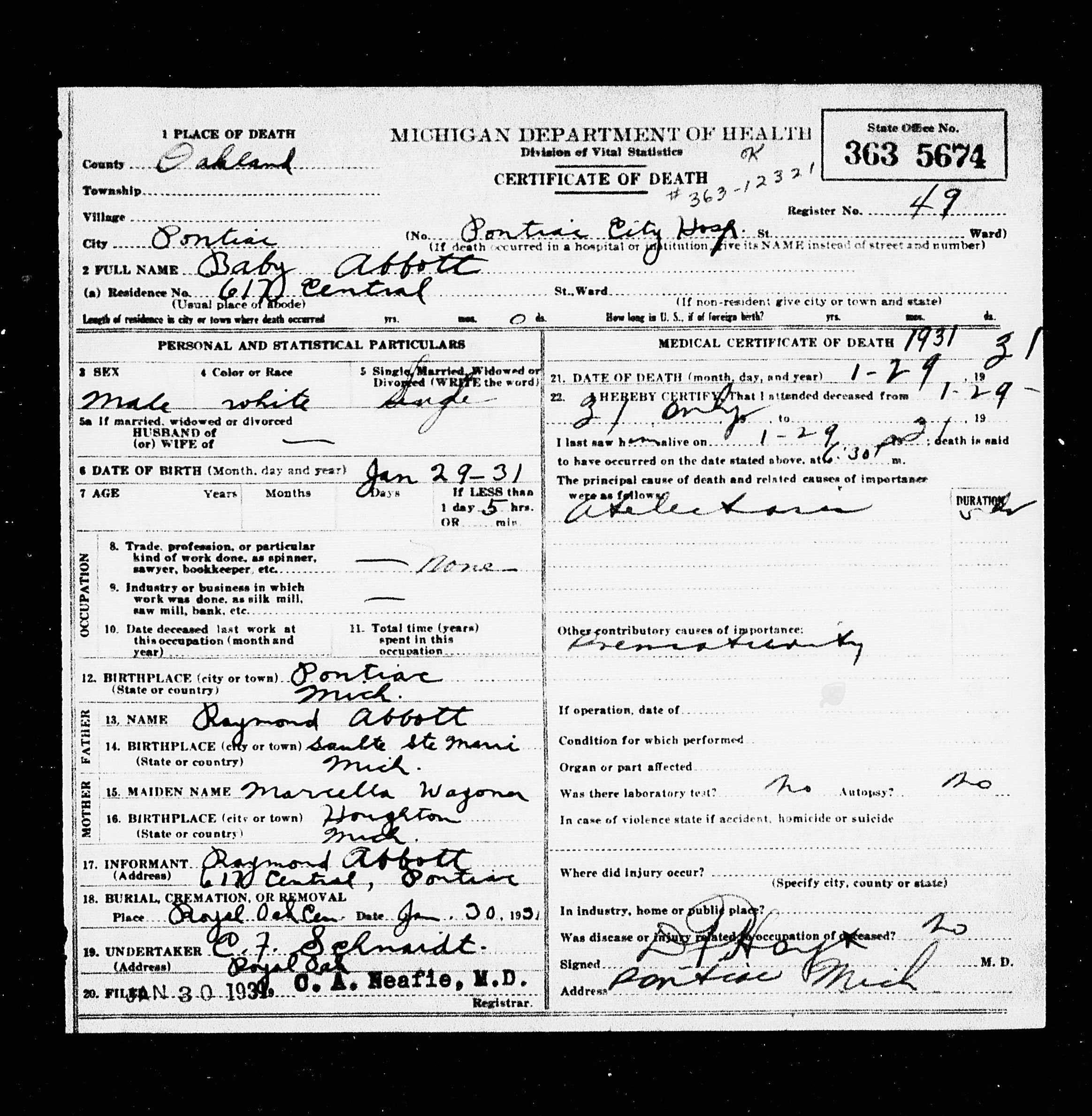 Died: Jan. 29, 1931 at Pontiac, Oakland Co., Michigan