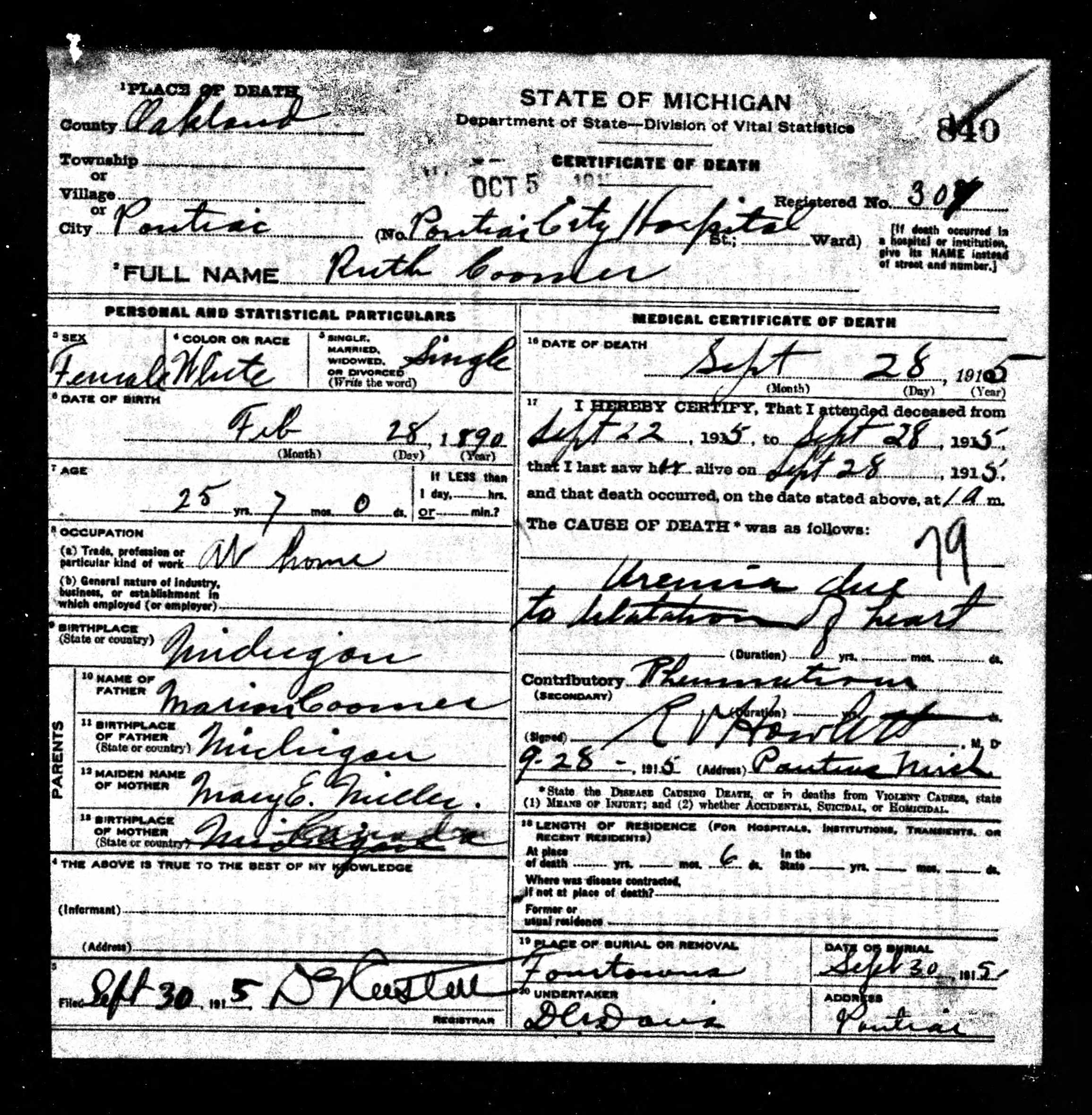 Died: Sep 28, 1915 at Pontiac, Oakland County, Michigan