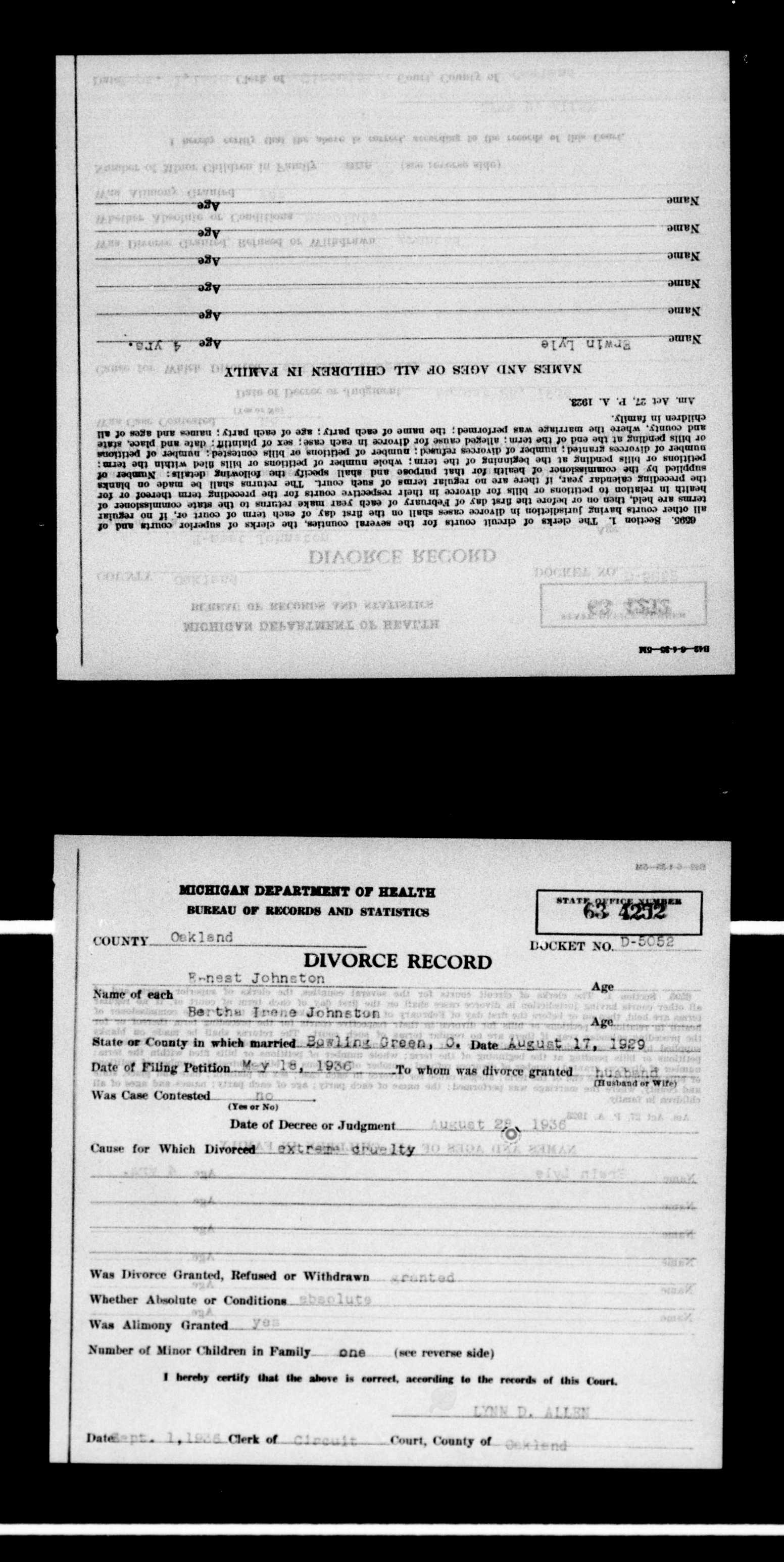 He graduated from Lake Orion High School in 1925. He divorced Bertha in Bowling Green, Ohio, granted on May 18, 1936. about the time of WWII, he worked for the Pontiac Motor Division of GM. At the time of the 1940 census, he was residing at 3097 Avalon St. Avon Twp., Oakland County, Michigan. In 1967 his last known residence was in East China, St. Clair County, Michigan.