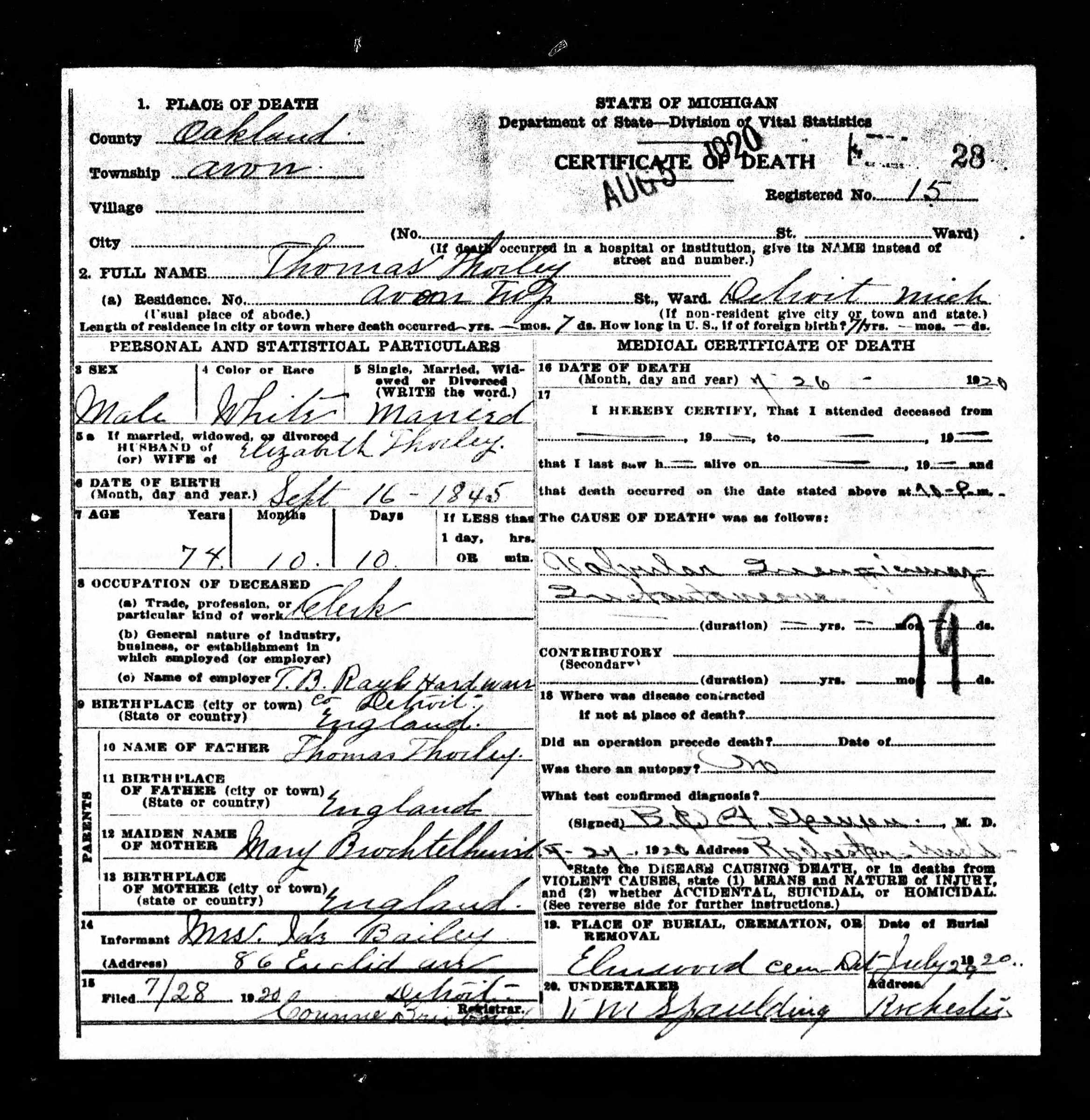 Died: Jul 26, 1920 Avon Twp., Oakland County, Michigan